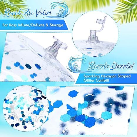 - Glitter Effects: the clear glitter balls will glitter in the pool in the sun, the glitter beach balls contain golden confetti, the confetti rolls with the ball, glittering in the sun to make your parties and games more interesting