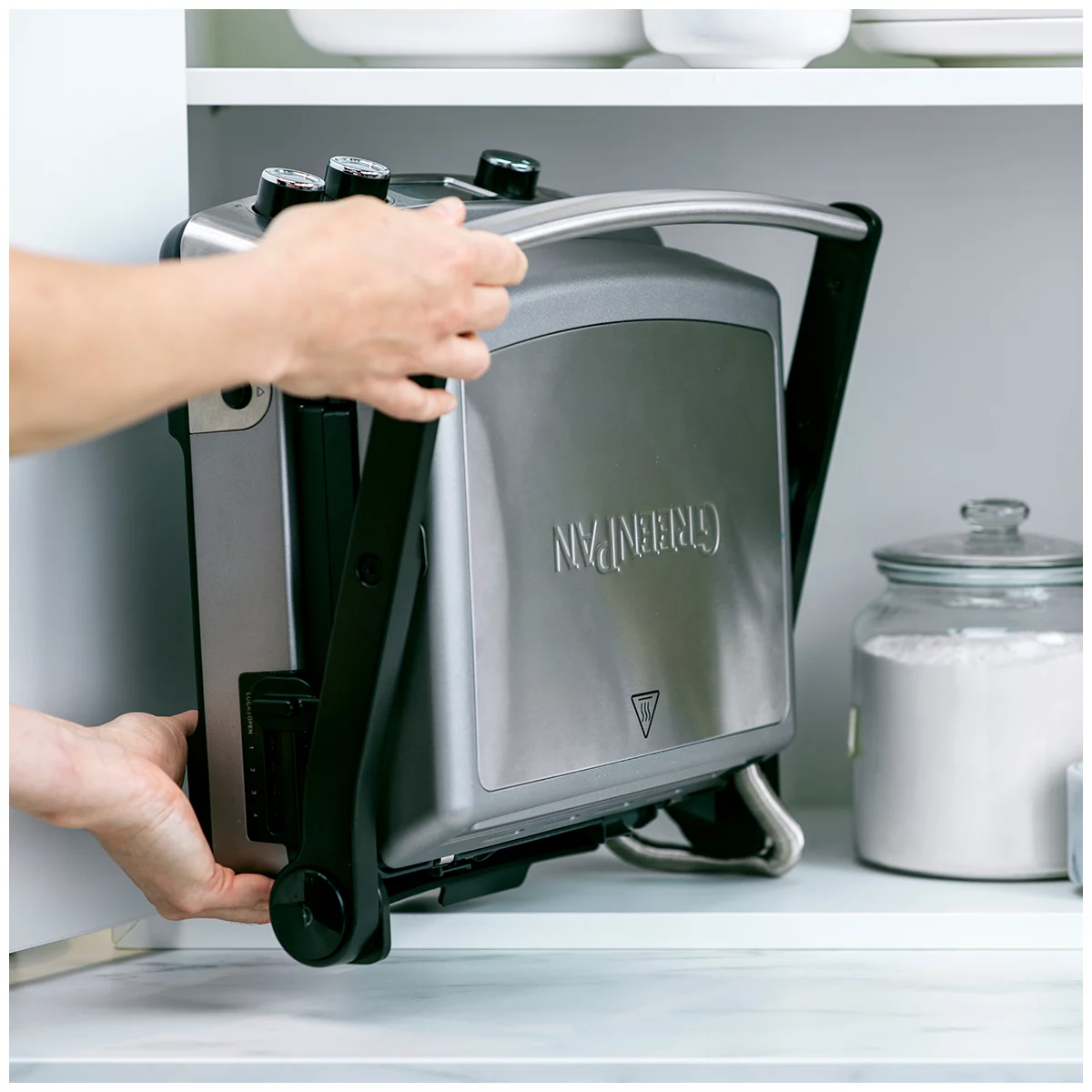 It opens flat to make sure you have room for your meal. The easy-to-use controls allow you to customise the time and temperature settings of each reversible cast aluminium plate. And cleaning up is simple thanks to Thermolon Volt, our pioneering ceramic nonstick coating made specially for kitchen appliances. Get more from your appliances with GreenPan.