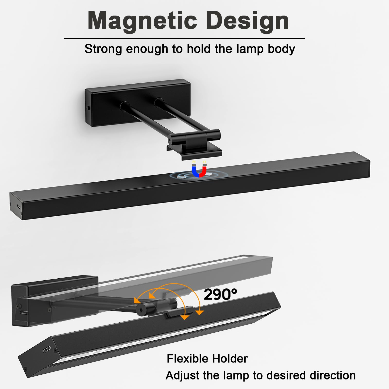• Easy to Use:The battery-operated picture light bracket can be easily installed with the included screws, and the light bar is fixed by magnets. You only need to remove the light bar when charging. The card slot secures the light bar, preventing it from shaking and falling randomly.
